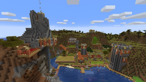 This settlement certainly spans a good range of elevation. There is a building above cloud level on one of the peaks - I call this structure Breezehome. It is a breezy place, and there probably aren't enough railings. You can travel down a bubble column from Breezehome to down a level and follow a short path to the alchemy facility, which hangs beneath an outcropping.