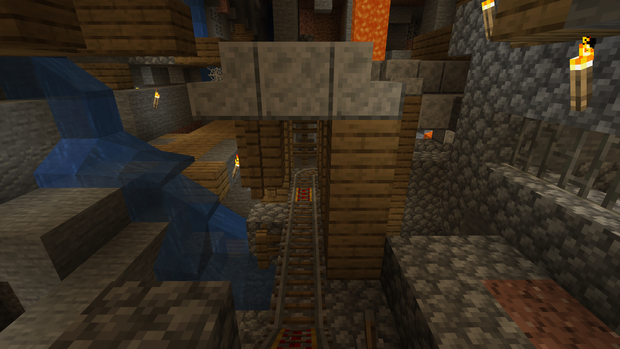 Once you pass through the Shattered Cove Nether portal, you can connect to a number of other settlements via protected minecart rails. The orange lines take you to either the Soulforge or the First Base. The Blue line takes you to the Swamp Home. If you want to go further, climb the scaffolding to the top of the Nether where you can catch the Long L Train to the Far Land base.